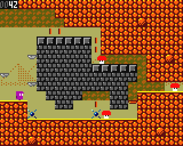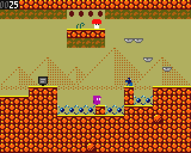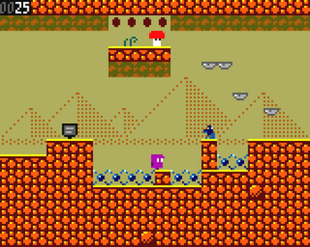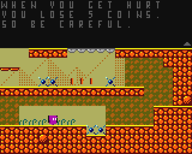 The game made for the fantasy console Lowres NX. It's a flip-screen platformer. A small hero collects coins. If he takes damage, he loses 5 coins. Also, some actions (double jump, using a powerball) cost one or two coins. If the hero loses all coins, the game is over.